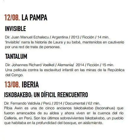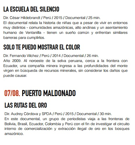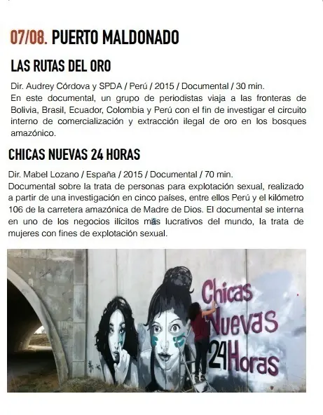Miwa Yavorova, la representante del centro cultural Pueblo Viejo, organizador de este evento, detalló que las temáticas de los productos audiovisuales abordarán los temas de la trata de personas, minería ilegal y comunidades indígenas. Recalcó que el evento es absolutamente gratuito.