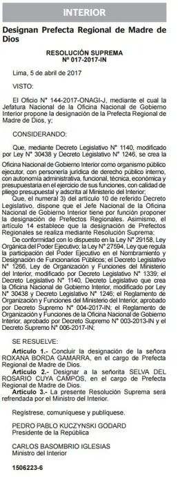 Desde el día de hoy Selva del Rosario Cuya Campos desempeñará la labor de Prefecta de la región según publicación de Normas Legales del diario El Peruano.