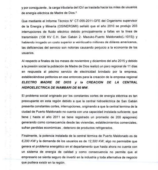 Como dato estadístico, se lee en el proyecto que en el año 2010 se produjeron 203 interrupciones de fluido eléctrico debido a las fallas de transmisión, en San Gabán. Además, se recuerda el paro regional de 11 días, en el año 2015, por el pésimo servicio de electricidad.