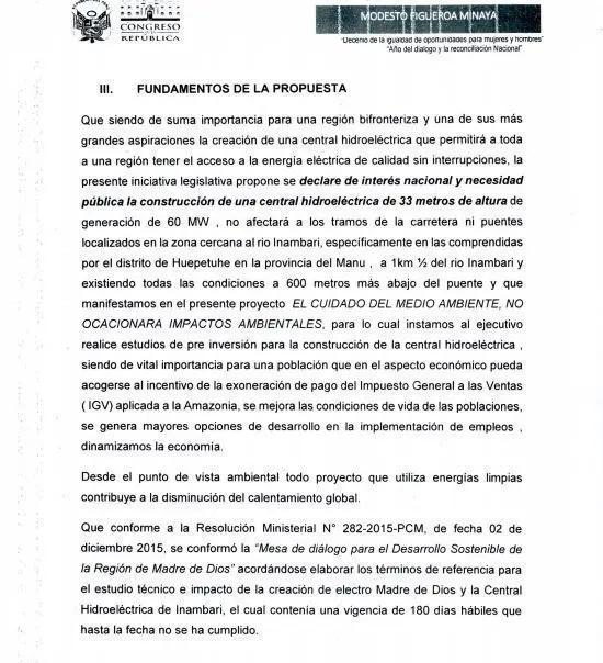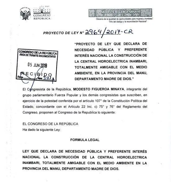 El 5 de junio los congresistas encabezados por Figueroa Minaya Modesto,Saavedra Vela Esther,Alcalá Mateo Percy Eloy,Castro Grández Miguel Antonio,Del Águila Cárdenas Juan Carlos,Domínguez Herrera Carlos Alberto,Elías Ávalos Miguel Ángel,Letona Pereyra María Úrsula Ingrid,Lizana Santos Mártires y Mamani Colquehuanca Moisés, presentaron el “Proyecto de ley que declara de necesidad pública y preferente interés nacional la construcción de la Central Hidroeléctrica Inambari, totalmente amigable con el medio ambiente, en la provincia del Manu, departamento Madre de Dios”.
