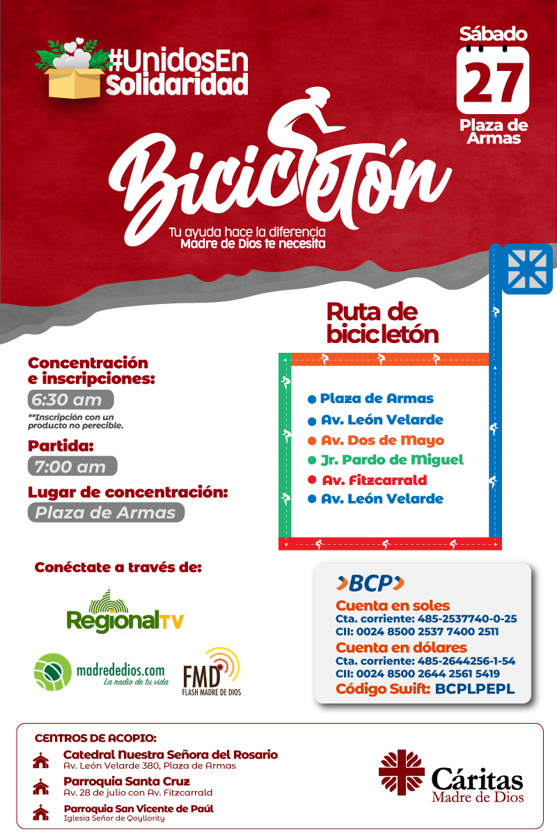 Este sábado 27 de febrero se llevará a cabo el “Bicicletón” como parte de la campaña Unidos en Solidaridad organizada por Cáritas Madre de Dios para atender a cientos de personas afectadas por las inundaciones causadas por el desborde de los ríos en la región.