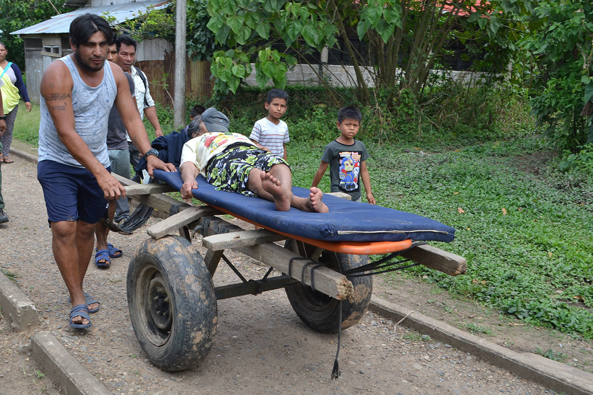 En la inauguración del primer punto de pago del programa Pensión 65, en Boca Manu, distrito Fiztcarrald, Madre de Dios, una señora de avanzada edad y beneficiaria del referido programa social, tuvo que ser trasladada en una colchoneta cargada por tres personas, ya que esta localidad no cuenta con una unidad acondicionada que permita trasladarlos ni siquiera al centro de salud.