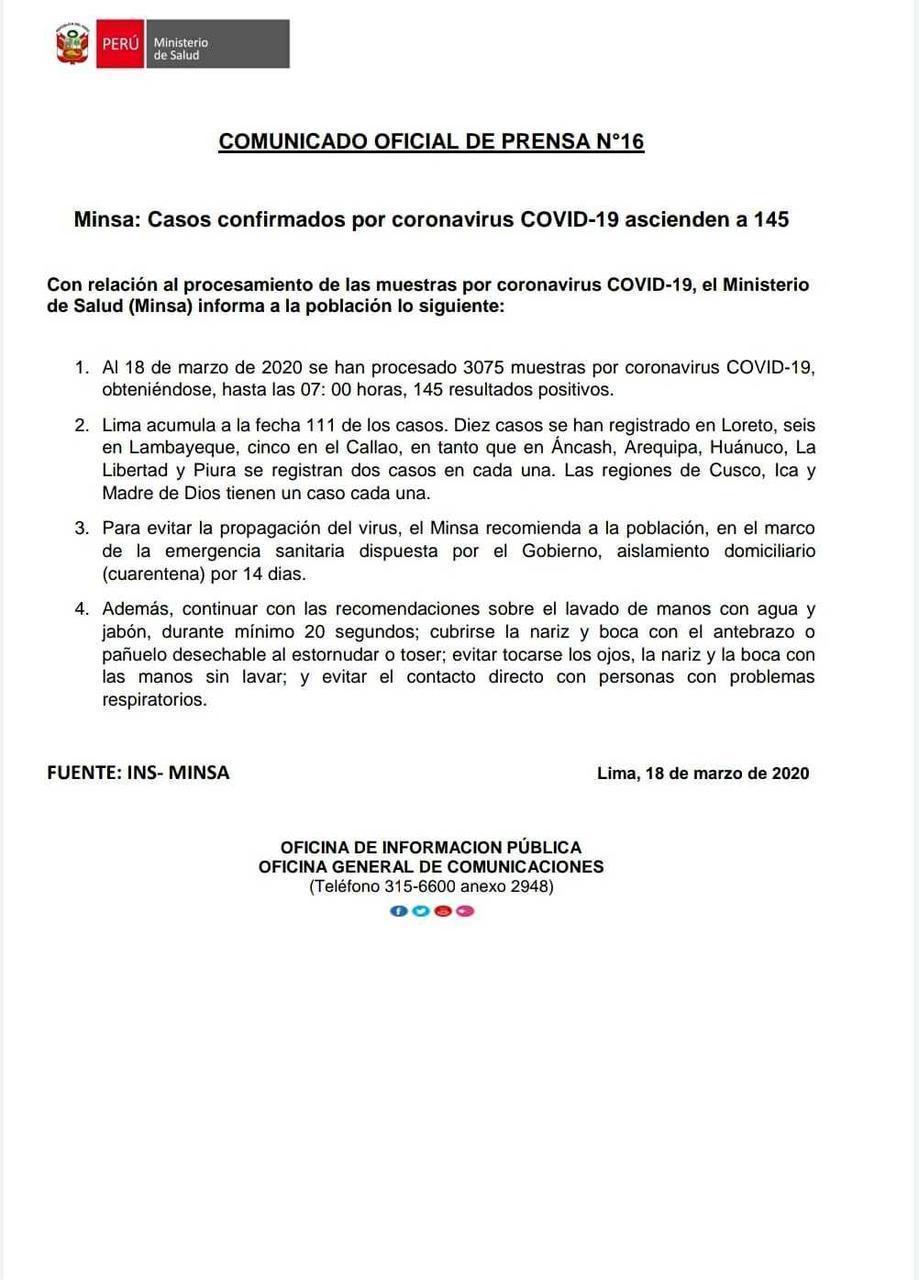 Por otra parte, el gobernador regional indicó que de esta manera se está cumpliendo con la labor de informar a la ciudadanía. Asimismo, instó a la población a mantener la calma y cumplir con el aislamiento social obligatorio dispuesto por el gobierno.