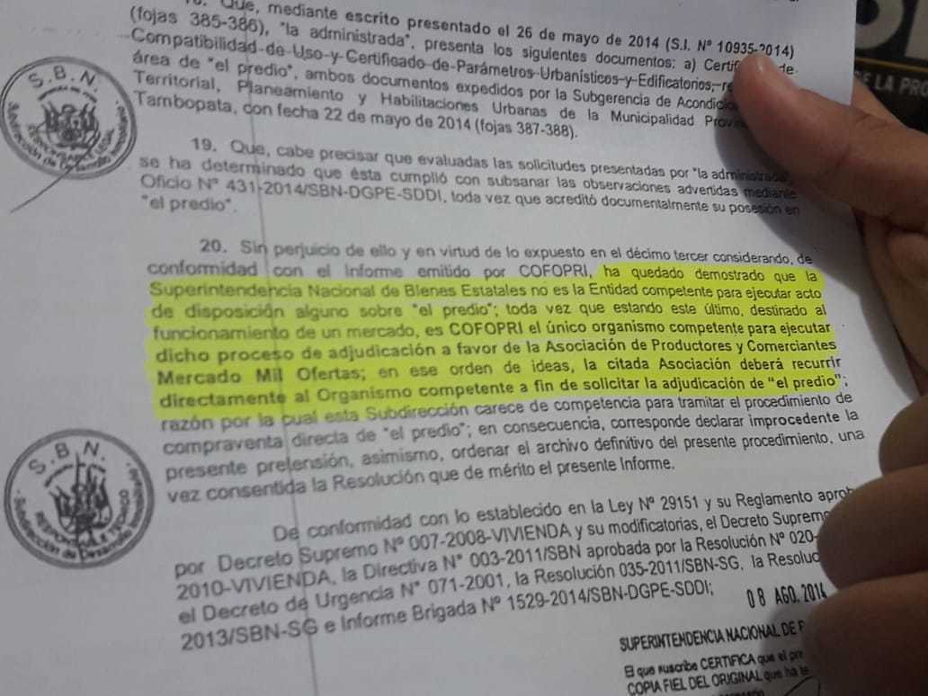 Finalmente, Espinoza recordó que COFOPRI nunca consultó con el Instituto Peruano de Deporte antes de colocar en venta el terreno a los comerciantes del mercado Mil Ofertas.