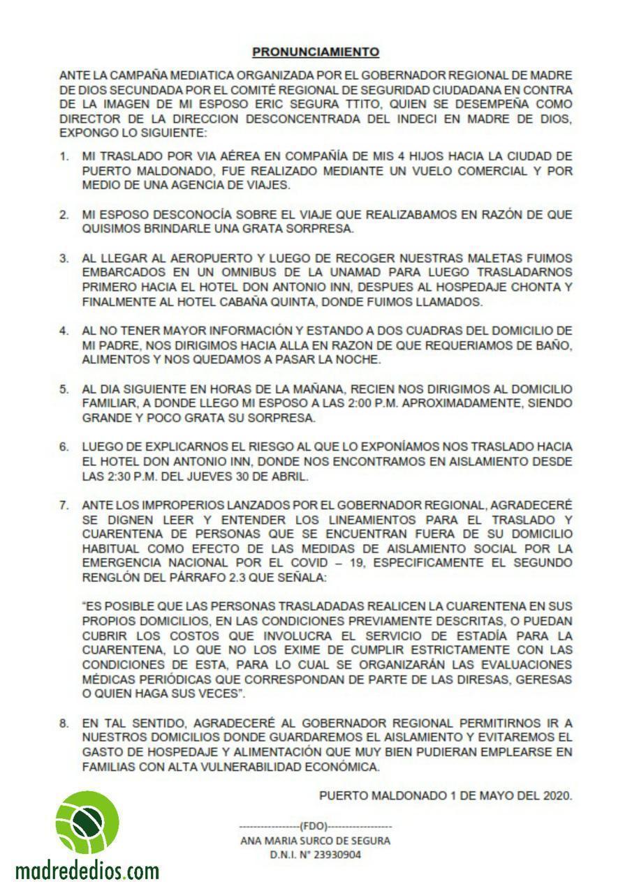 Por otra parte, Ana María Surco de Segura, esposa del director de Indeci Madre de Dios, emitió un pronunciamiento "ante la campaña mediática organizada por el gobernador regional de Madre de Dios secundada por el Comité Regional de Seguridad Ciudadana" en contra de la imagen del director del Indeci Madre de Dios.