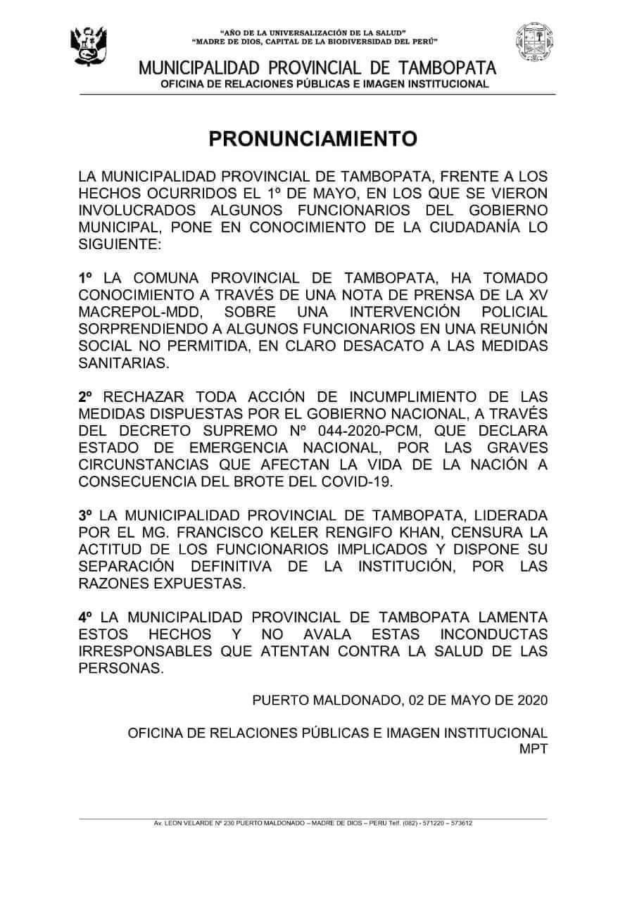 La Municipalidad Provincial de Tambopata ha dado a conocer a la opinión pública la decisión de separar definitivamente a los funcionarios que fueron intervenidos durante un operativo policial realizado este viernes. La comuna también deja claro en los cuatro puntos de este pronunciamiento que rechaza, lamenta y no avala estas inconductas irresponsables.