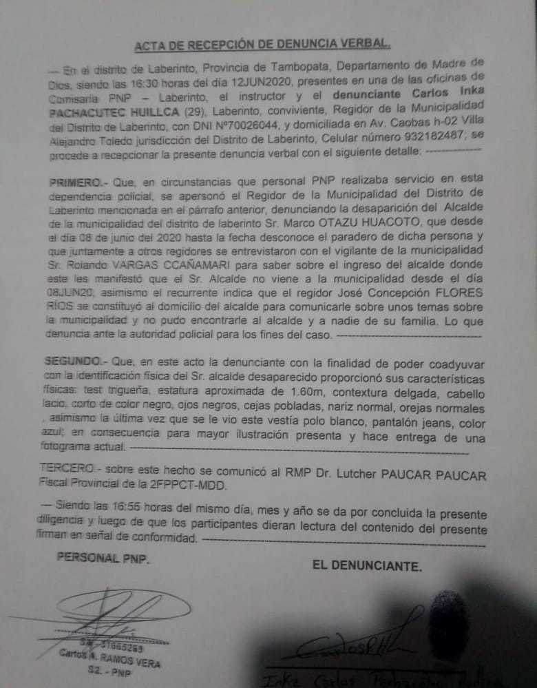 El teniente alcalde de la municipalidad distrital de Laberinto, Carlos Pachacutec, informó en entrevista para radio Madre de Dios, que luego de que el alcalde Marcos Otazu se ausentara por cinco días de la comuna, se realizó una denuncia por la desaparición en la policía.