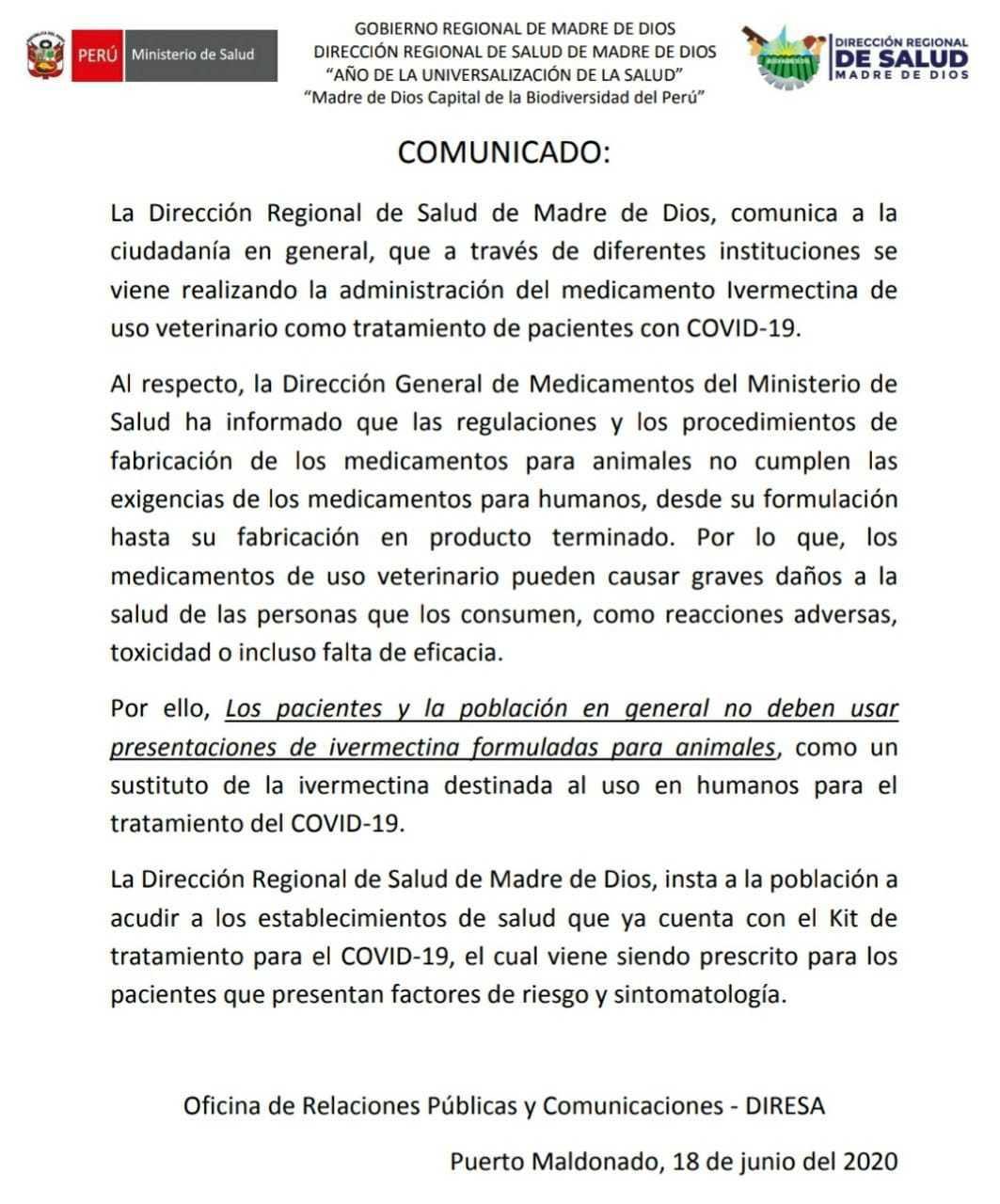 El director regional de Salud recalcó a la población que no debería usarse la ivermectina para uso veterinario porque se ha comprobado que puede producir daño hepático y renal.