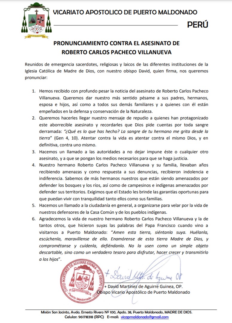Pocas horas después de confirmarse que, en el kilómetro 74 de la carretera Puerto Maldonado-Cusco se había encontrado sin vida el cuerpo de Roberto Carlos Pacheco, hijo del vicepresidente del Comité de Gestión de la Reserva Nacional de Tambopata, Demetrio Pacheco, el Vicariato Apostólico de Puerto Maldonado se ha pronunciado sobre este suceso tras el que, se indica, hay múltiples intereses que tendrían que ver con las denuncias que la familia viene realizando desde 2012 en relación al ingreso de extraños a su concesión forestal. Un asesinato que ha indignado en la región.