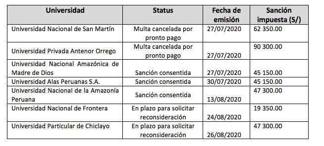 Las universidades sancionadas por inacción o faltas en esta materia son: Universidad Nacional de San Martín, Universidad Privada Antenor Orrego, Universidad Nacional Amazónica de Madre de Dios (UNAMAD), Universidad Alas Peruanas S.A., Universidad Nacional de la Amazonía Peruana, Universidad Nacional de Frontera y Universidad Particular de Chiclayo.